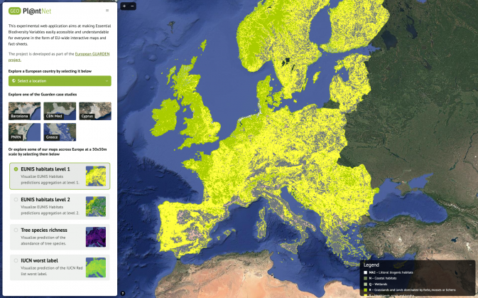 GeoPl@ntNet is an interactive web application that makes Essential Biodiversity Variables accessible and understandable through dynamic maps and fact sheets. Its main purpose is to allow users to explore high-resolution, AI-generated maps of plant species distribution and biodiversity indicators across Europe. These maps, developed as part of MAMBO’s sister project GUARDEN, provide an intuitive and information-rich interface to better understand plant biodiversity in specific regions. The platform is available to authorised users via a designated URL.