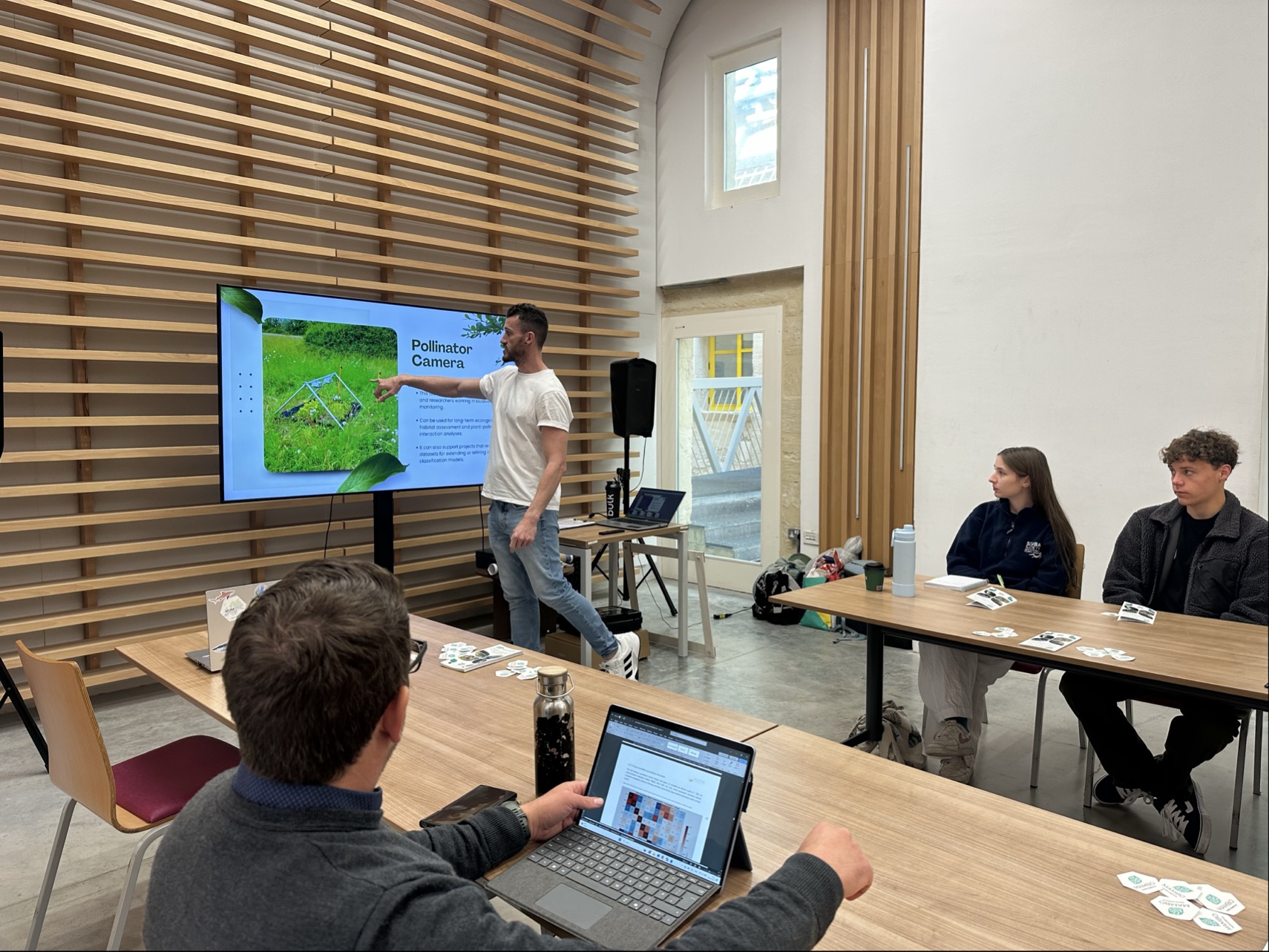 A practical demonstration followed in the conference centre’s roof garden, where participants had the opportunity to observe selected devices in operation. The pollinator cameras and Audiomoth were presented in detail, with live explanations of their technical setup and functionality.