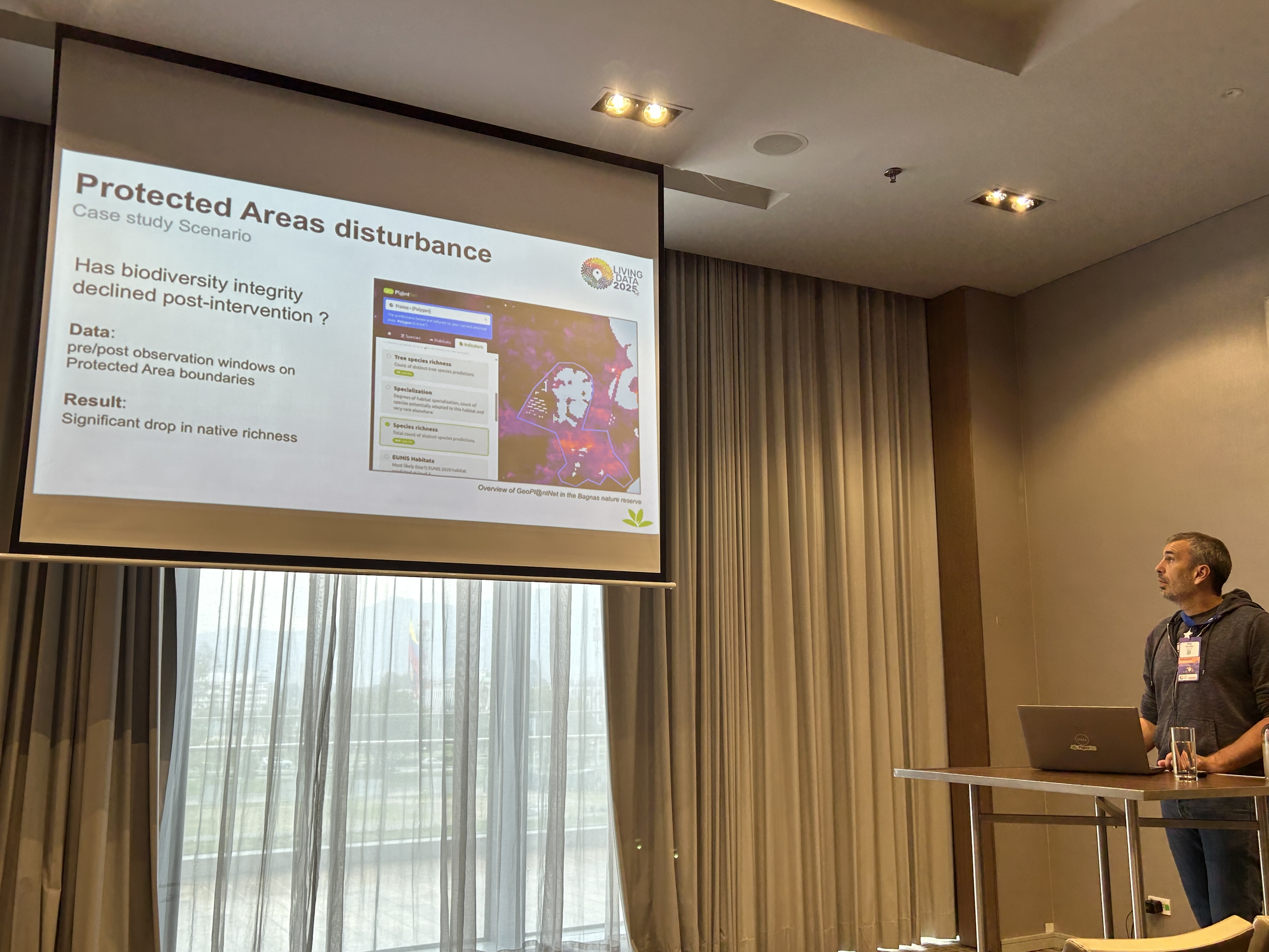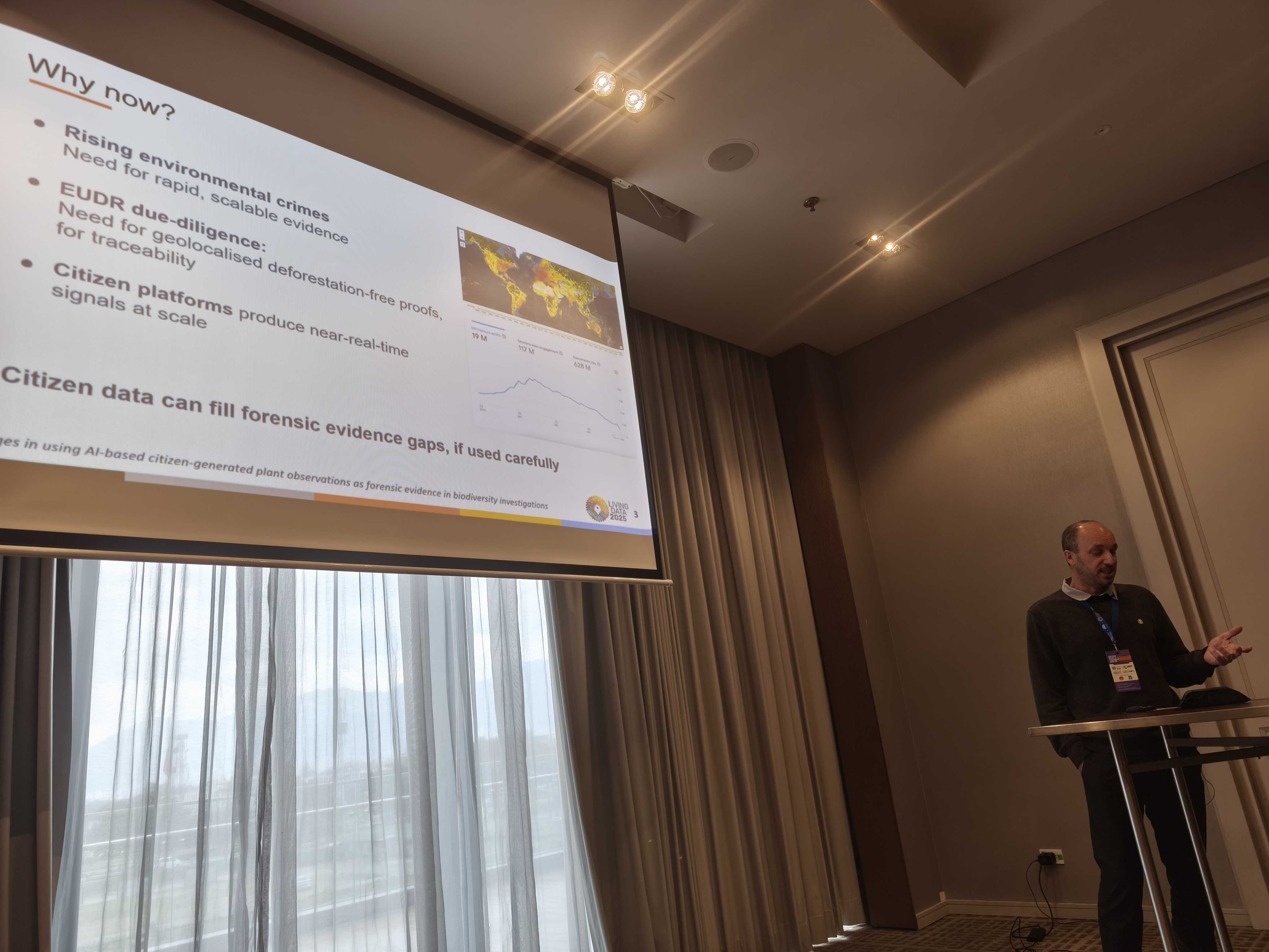 Building on these reflections, MAMBO partners presented “A High-Resolution Biodiversity Mapping Platform for Environmental Forensics”, introducing GeoPl@ntNet, a new open-source platform developed within European projects to visualise and analyse high-resolution plant biodiversity data. GeoPl@ntNet uses millions of geotagged observations collected by scientists and citizens to produce predictive maps of plant species distributions. In a complementary talk, we presented “Challenges in using AI-based citizen-generated plant observations as forensic evidence in biodiversity investigations”. We explored how massive, AI-validated citizen science datasets from platforms like Pl@ntNet can provide timely, geographically precise information for biodiversity monitoring, and potentially serve as supporting evidence in environmental crime investigations.