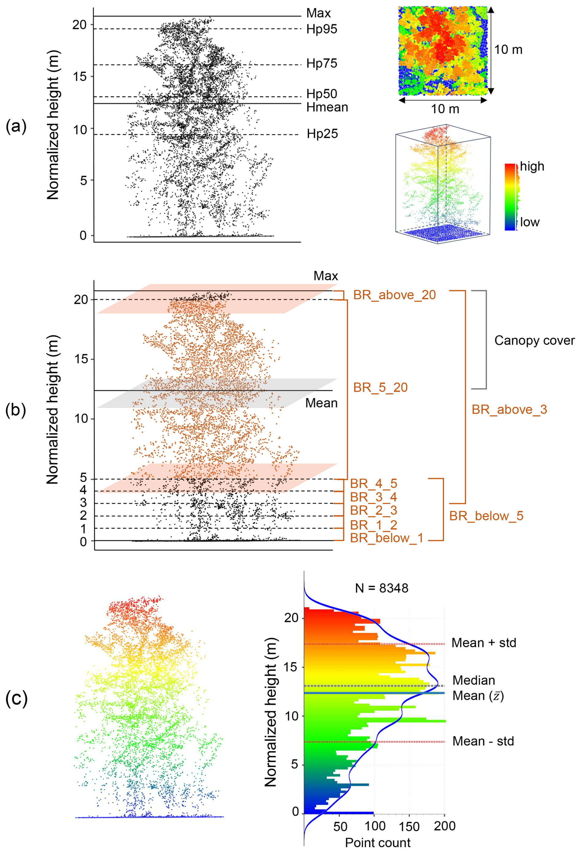 Examples of lidar metric generation in a 10 m × 10 m grid cell (the number of all points: N = 8348). (a) Metrics of vegetation height (mean, max, and percentiles of normalized height). (b) Vegetation cover metrics representing vegetation density within specific height layers (e.g. “BR_4_5” indicates the vegetation density between 4–5 m; feature name: “band_ratio_4_normalized_height_5”). (c) Metrics of vegetation structural variability (e.g. standard deviation and variance of vegetation height are calculated based on mean height ; kurtosis and skewness of vegetation height are calculated based on the standard deviation and mean height within a cell) (see detailed calculation formula in Table 3). The blue line in (c) represents a kernel density estimate (KDE) showing the shape of the point distribution. Adapted from Shi et al. (2025): https://doi.org/10.5194/essd-17-3641-2025